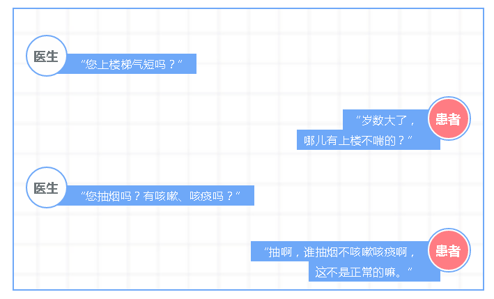早期慢阻肺患者可能没有明显的症状,或仅仅有咳嗽和咳痰,容易因忽视而漏诊。等到患者出现稍微活动即气喘吁吁等症状时,疾病往往已经进展到了中晚期。