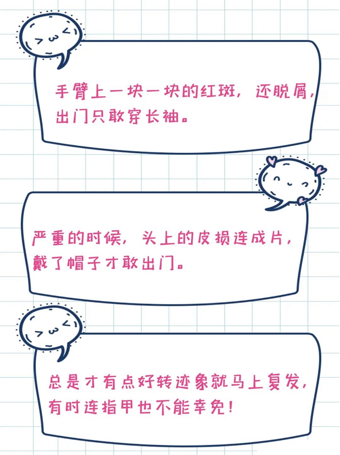 症状:临床表现以红斑,鳞屑为主,全身均可发病,以头皮,四肢伸侧较为常见,多在冬季加重。